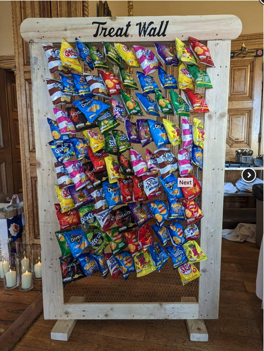 Introducing the Crisp Wall, a must-have addition to Weddings and events, or amy occasion. Say goodbye to traditional flower walls and make a statement with our unique and interactive snack wall. Perfect for weddings, parties, corporate events, and more, the Crisp Wall is a space-saving and eye-catching feature that will delight your guests.